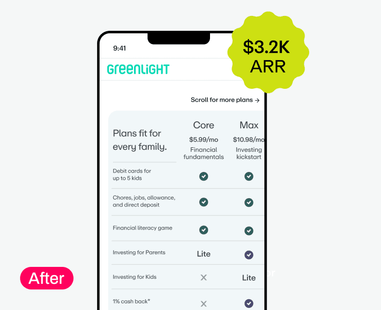 For modernization and elevated product storytelling for guided conversions, we built a Greenlight savings calculator, added an app feature showcase, and introduced subtle animations across landing pages. The app feature animation alone increased registration CVR by 26.23% and 6.9%.